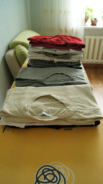 Все сложила аккуратно и получилось у меня 3 кучки. Футболки на выход, футболки для дома, и легенькие кофточки с длинным рукавом. Все отправила в шифоньер.