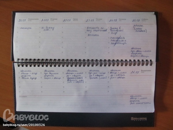 В качестве семейного календаря я использую планер, причем завела его задолго до первого взлета. Т.к. память у меня дырявая, то для меня это незаменимый помощник Вот так он выглядит (девочки, фото с прошлого взлета, потому что сегодня забыла его сфотать, а сейчас в фотике сели батарейки, но календарь выглядит также, единственное отличие, сейчас я там не пишу меню для сынули)
