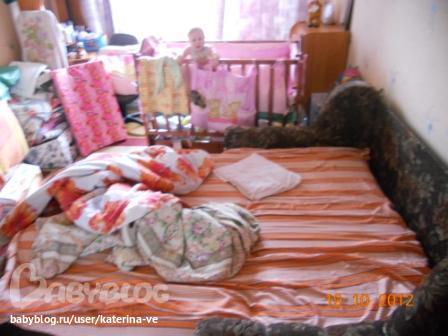 Постель заправляю с прошлого взлета. раньше у меня была отмаза - ребенок не ползал, и можно было весь день диванчик не собирать. А теперь все, лафа окончена, по полу лазим. Так что УР - обязательный пункт. Адоча глядит из кроватки))