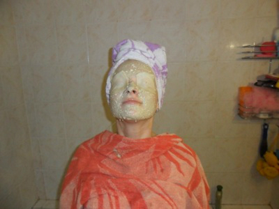 . У меня на волосах маска (напишу, когда будем уход за волосами проходить), на лице маска (творог, белая глина, сметана, молоко).На глазах патчи с отваром ромашки, на губах мед.