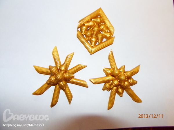 У меня получились вот такие игрушки на ёлку) Из макарон, которые оказались сегодня дома)