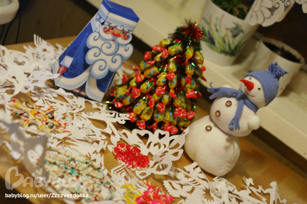 Кстати, тут же видна еще 1 елочка из конфеток и снежинки (их навырезала много)))))