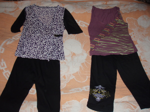 Примерно так выглядит мой повседневный гардероб. (Сегодня на мне вариант с фиолетовой майкой). Кофт и штанишек, наподобие того, что на первой фотке, у меня достаточно, вроде бы все выглядят вполне приемлимо. Еще случаются шорты. Юбок в гардеробе почему-то нет. Сарафанчик надеваю обычно по выходным, когда муж дома.