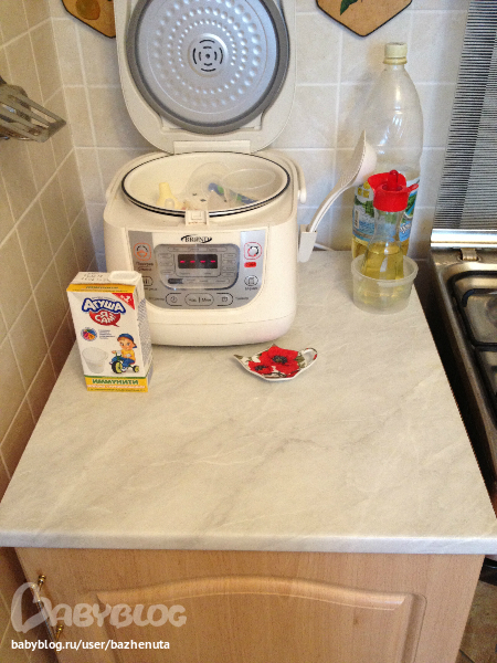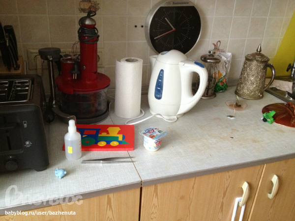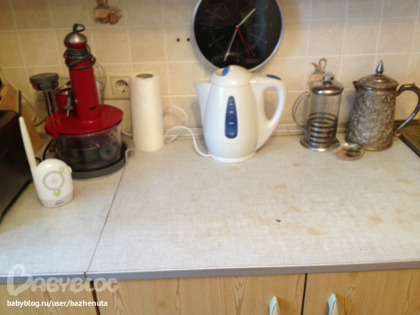 Оговорюсь, что кухня очень старенькая, пятна на столешнице уже ничем не оттираются((( А на часы (для внимательных) не стоит обращать внимание, кухню всю я как раз разобрала сразу после прочтения задания (мы утром на Манту ходили, потом обедали, укладывались)! Просто наконец-то вставила батарейку в часы))