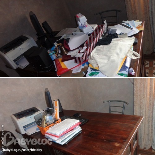 Отчитываемся по заданиямВ сумочке почти порядок, потому чт осовсем недавно разбиралась там и вообще стараюсь делать это регулярно, поэтому решила начат ьс той самой комнаты. в которую не то что гостей, а самой заходить неприятно. Это вообще самая бестолковая комната в нашем доме: "Кабинет". он в кавычках, потому что на кой черт муж вообще завел этот кабинет -я вообще не понимаю, потому что тот один день в неделю который он, и то не целиком, проводит дома, в кабинете ему делать абсолютно нечего. Поэтому этот "кабинет" у нас прост опостепенно преваращается в склад ненужных вещей. Стол до и после.