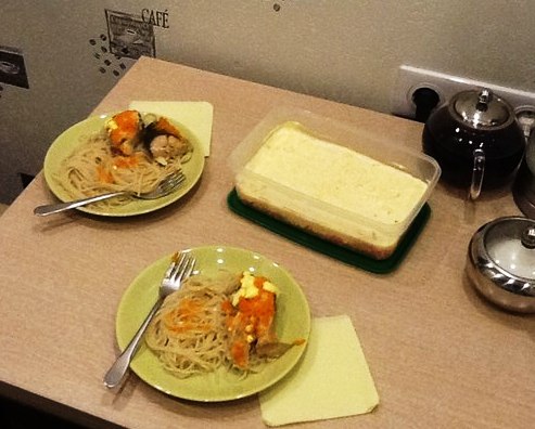 наш ужин: горбуша с морковью,луком в мультяшке, спагети и салат (краб палочки, ананас и яйцо)