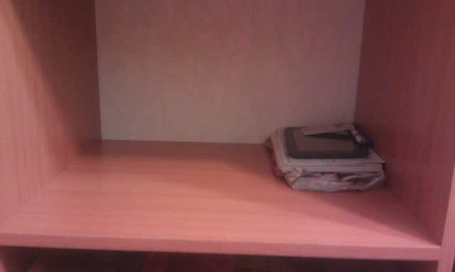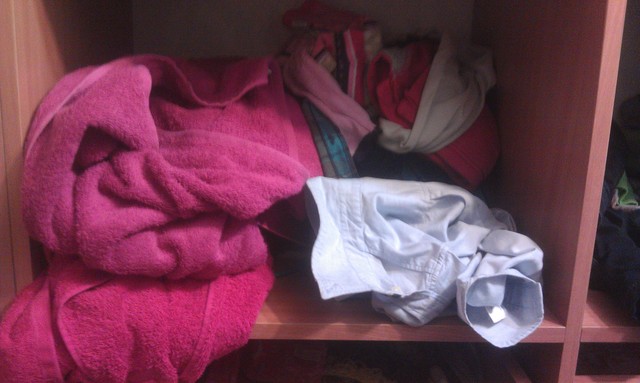 Итак номер один- полка в спальне. Туда сваливается все- детская одежда, вещи которым нет места (резиночки, книжки, полотенца, тетрадки). До конца не считаю разобранной, остался мужа планшет и листочки от блочной тетрадки.