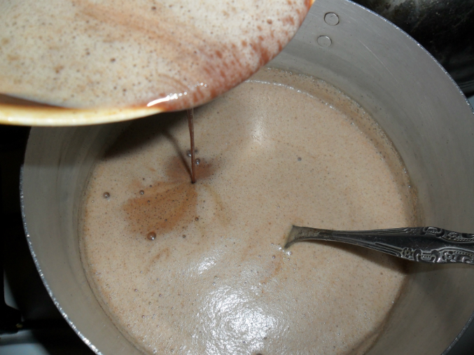 Остальную часть молока (а именно 400 г-500 г) ставим в каструльке на огонь. Нагреваем молоко почти до кипения, но что бы не кипело и тененькой струйкой вливаем туда нашу смесь постоянно помешивая. огонь маленький.