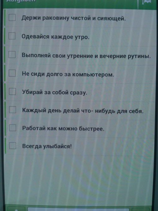 В смартфоне на андроиде. В google play store есть app . У меня здесь в Германии этот App называется Heim Organizer. Русский язык тоже можно выбрать. Там как раз на систему FlyLady рассчитано. Там даже ссылка есть на задания Келли, правда, на английском, потому что на оригинальный сайт FlyLady ссылаются.  Этот App еще FlyHelper называется.