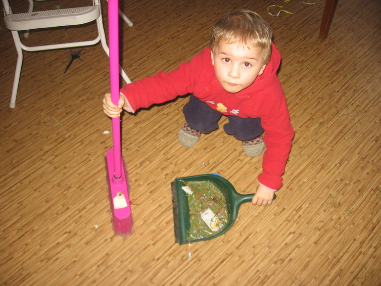 А на второе, решили убирать большую Ёлку, а то уж много она места занимает, парни уже велики обратно просят, а кататься негде! До праздника оставим маленькую))))