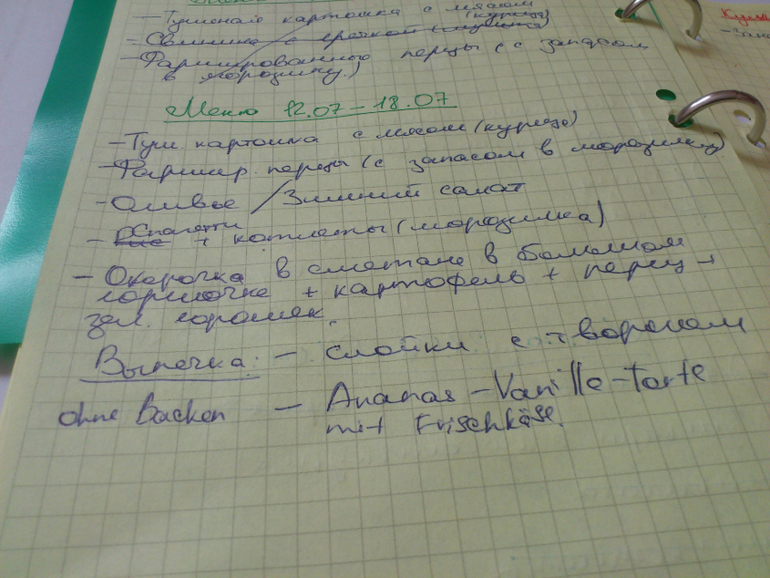 4. Мы полноценно питаемся обедами, завтрак и ужин - более легкие, молочка, бутерброды (немецкая норма - абентброт), иногда выпечка, пицца собственного приготовления. У детей конечно все иначе. Норма у мужа - малоежки - полноценное горячее на обед. Планирую обеды только обеды с учетом взять собой в будни или кушать дома в выходные. Обычно готовлю каждый день, нно сейчас с появлением второго ребенка чаще на 2 дня. План всегда гибкий - список блюд, с 1-2 быстрых блюд на случай если приготовить не удается. Планирую всегда с субботы по пятницу, в пятницу день закупок. Меню на предстоящую неделю в КЖ: