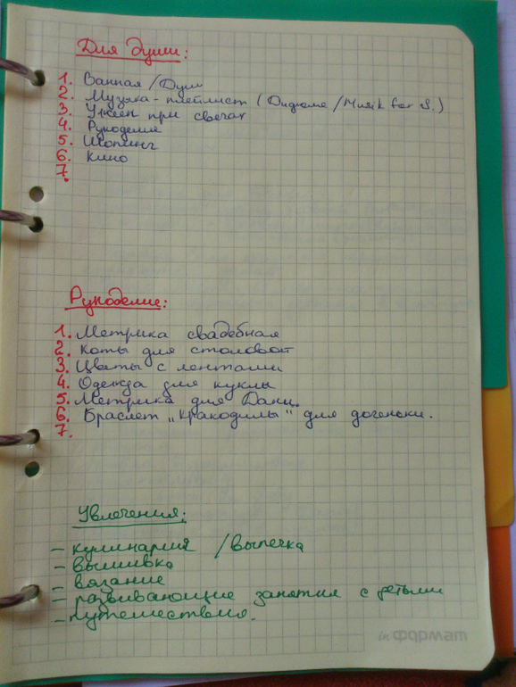 6. Увлечения. Лист со списками в КЖ. С планированием временни на хобби сложно, делаю когда все остальное надоело и хочется отдохнуть.
