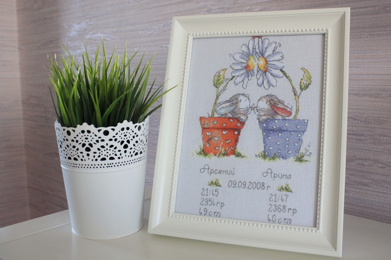 Итак , идем дальше....Одно из самых мною любимых занятий - вышивка, все началось во время первой беременности, увлеклась сильно. Вышивала в основном на подарки, т.к. в интерьере собственной квартиры не знаю где вешать картины )) парадокс )) Для себя оставила пока только две - это метрика моих старшеньких и трио ангелочков, символизирующих всех моих детей ))) Очень много незаконченных работ, с рождением третьей дочки, все мое хобби отошло на последний план...