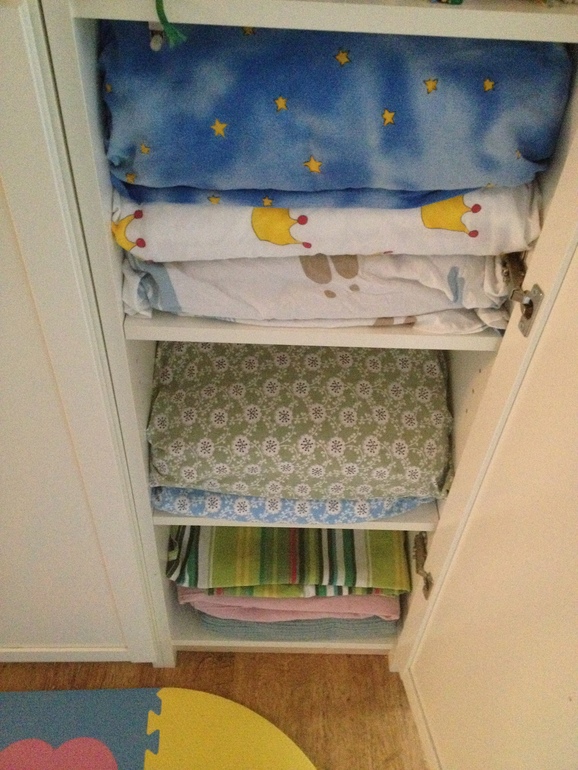 Для детского белья полки узкие, поэтому я укладываю их так. Не так уж и аккуратно, но очень удобно. Дети сами достают нужный им комплект. Внизу лежат запасные покрывала для детской (не знаю как ваши дети, а мои легко могут что-то пролить на них, поэтому у нас правило - испачкал покрывало - неси сразу в стирку и стели новое)