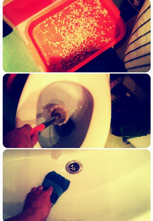 Идем в ванную, тут у нас по УР уборка кошачьего лотка, полет с ершиком и протирание раковины. Все сияет! УРА!