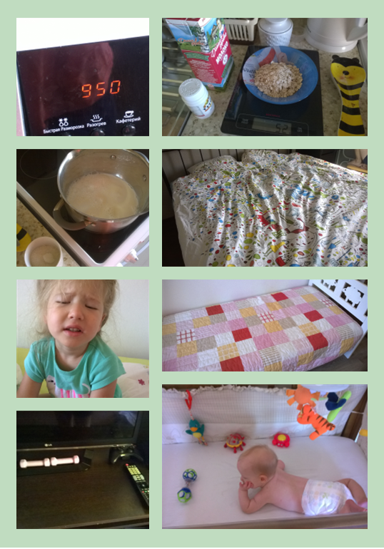 Папе и Ане манная каша, для меня овсянка. А тут как раз и Анечка и проснулась) Пока кашка варится иду к ней (по пути до спальни проверяю остальные ХС - все чисто). Муж тоже встал, кроватки заправлены. Младшая лежит играется.