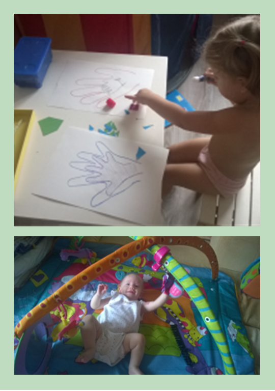 Порадовались вместе, да так сильно, что разбудили Ксюшу. Ну что ж, кормлю ее и отправляю играть. Анютка отправляется за стол рисовать и клеить (ведь нельзя же к прабабушке ехать без поделки! :)