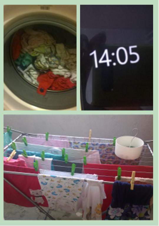 14:05 Машинка закончила стирку. Иду вешать белье. В этот раз мне почему-то никто не помогает( Дочь зависла у телевизора.