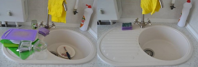 На кухне нашей раковине всего 2 дня. Поэтому она чистая. Навела порядок и протерла раковину.