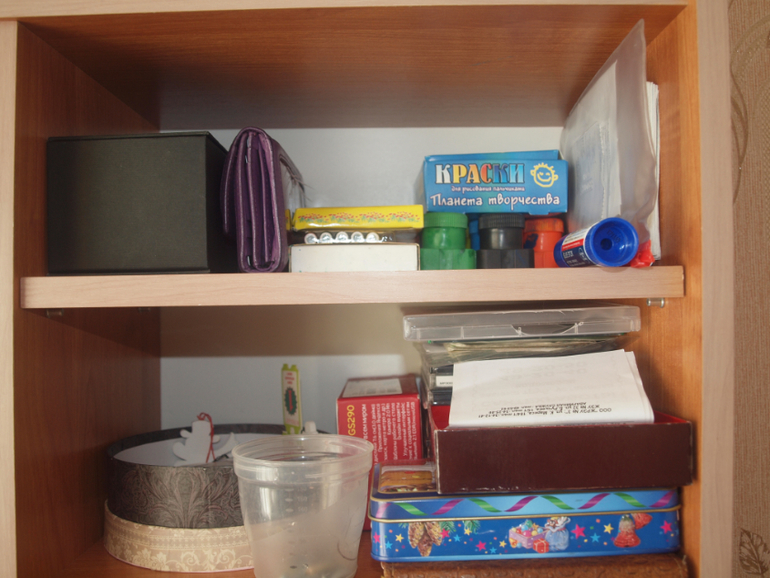 есть у нас 2 отсека полки над столом письменным, муж из них помойку делает, мелочи кидает, да так там мелочи. Вышли из положения, я убралась и поставила коробочку для мелочей, коробочку для небольших и нужных бумаг, визиток и пластиковых карт, коробочка под его табульки (он их собирает, оказывает. нужно). Периодически заглядываю и смотрю, нет ли лишнего, это проще. Сегодня убралась еще в одном отсеке. Признаюсь, пара ХС заняла чуть больше двух минут, некоторые меньше. Но просто бросать никак нельзя, да и времени не на много больше потребовалось