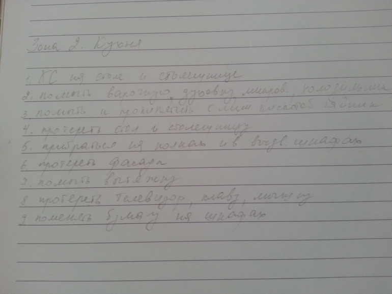 Пока получилось так: ХС на столе и столещнице; помыть варочную, духовку, микроволновку, холодильник; помыть и прокипятить с лим.кислотой чайник; протереть столещницу и стол; прибраться на полках и в выдвижных ящиках; протереть фасады; помыть вытяжку; протереть телевизор, клаву, мышку, системник; поменять бумагу на шкафах.
