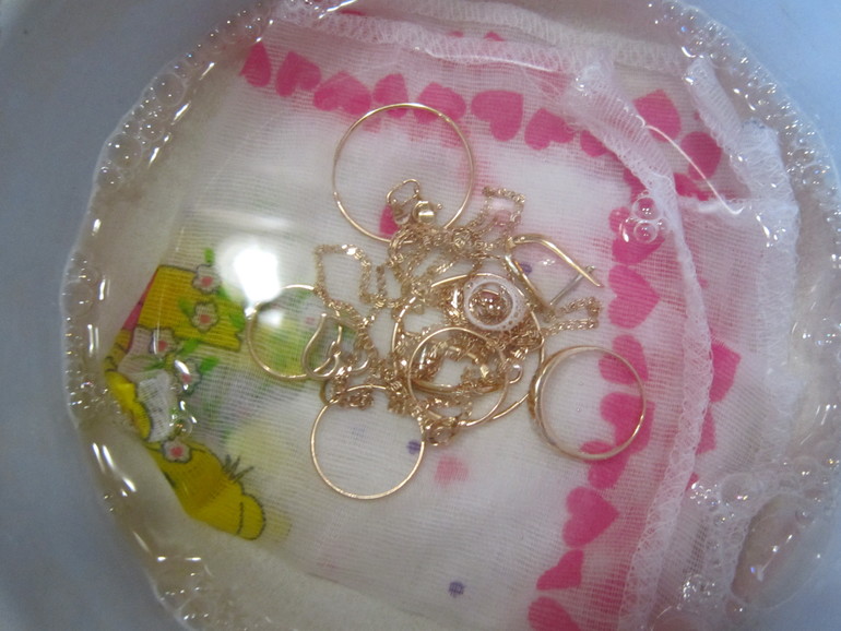 Золотые украшения без камней почистила так: в кастрюльку положила тряпочку, на нее украшения, добавила стакан воды, 1 ч. ложку средства для мытья посуды, прокипятила 5-10 мин, промыла проточной водой.