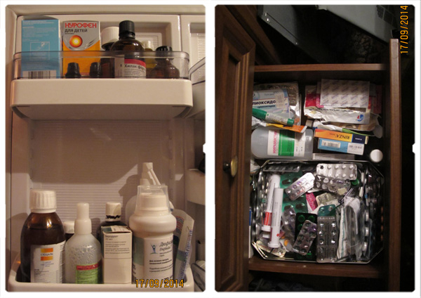 Аптечку перебрала еще раз. Часть в шкафу, часть в холодильнике. Часть в "переноске", то есть мобильная.