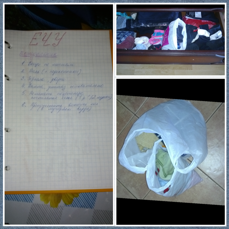 На фото еще пара пакетов хлама из кладовки и комода, а также мой ЕЧУ. В прошлом взлете я его делила на два ЕПЧУ. Сейчас засеку время час и посмотрю, как уложусь. Если затрачу больше времени-что-нить выброшу в работу в зоне. Как-то так.