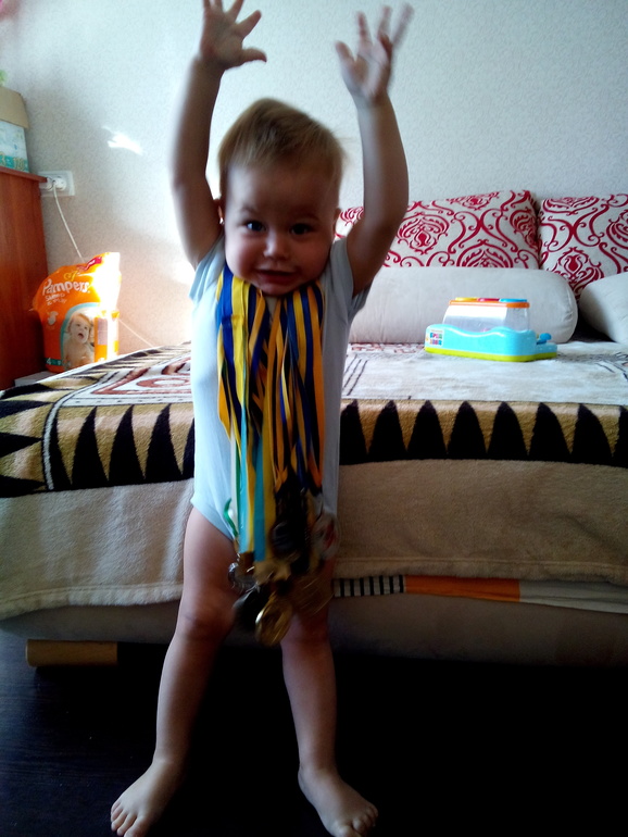 А еще мы с Матвеем перебрали все наши с мужем медали) Матвей их применял) снимать не хотел, сошлись на том, что сам выиграет их не меньше)