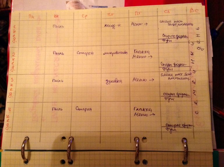 Решила объединить эти два дня по той причине, что ЕЧУ у меня неразрывно но связан с БНП. Как такового ЕЧУ у меня практически нет, так как полы дома я мою каждый божий день.... собака потому что. А все остальные дела распределила по неделе, вот и получился одновременно БНП. Оформила все в виде таблицы, чтоб нагляднее было: