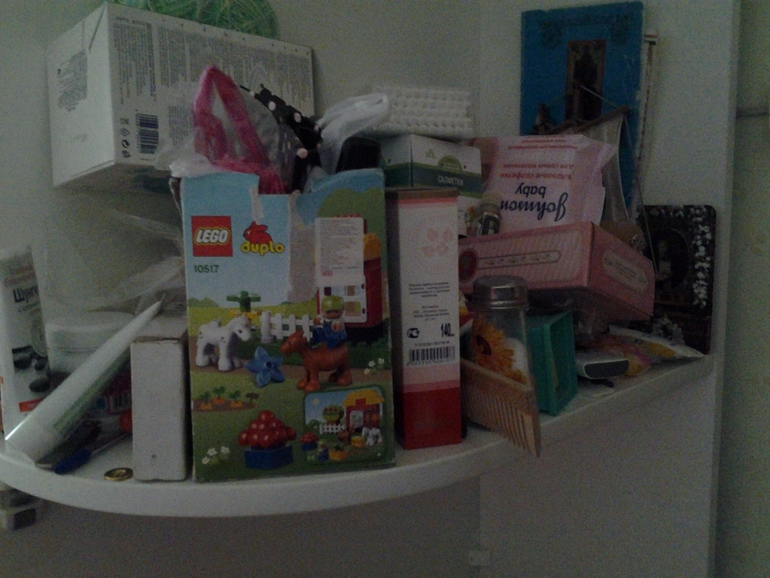 Вечером разобрала угловую полочку сбоку от шкафа (давно она мне покоя не давала), выполнив таким образом сразу несколько заданий, это и работа в зоне 4, и задание К, и расхламление, и ХС.