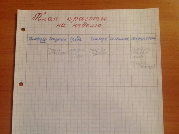 Предлагаю создать календарь красоты: неделя, месяц, год!) - Меня хватило только на неделю)) И то, пока в карандаше, т.к. средств по уходу особо нет))