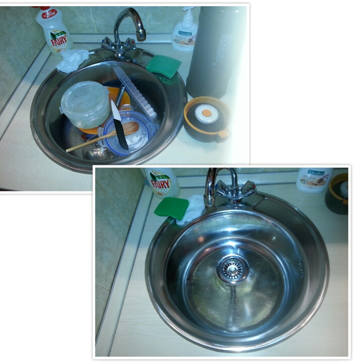 Сегодняшнее задание для меня известно :) я временами его делаю, когда совсем запущу раковину. В связи с праздниками, совсем запустила кухню. Вот так сегодня вечером встретила меня моя красавица. И результат после работы. Я пользуюсь советом флаюшек - заливаю раковину горячей водой, наливаю туда доместос, ну и потом еще прохожусь пемолюксом и какие-то пятнышки оттираю меламиновой губкой - она просто чудо!