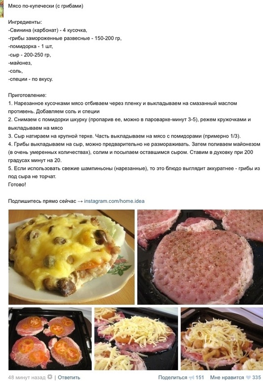 Готовлю еду. На обед у меня уже есть гороховый суп. А вот на ужин я решила опробовать новые блюда, которые утром лежа в постеле нашла в ленте. Это будет мясо по-купечески с грибами (рецепт немного изменила)))