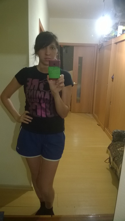 Волосы мою с вечера, утром делаю хвост.Сейчас на голове хаос, пора подстригаться.Это на след.неделе. Сейчас одела футболку и шорты, правда без обуви( не ругайся) Просто сейчас в душ и спать)))