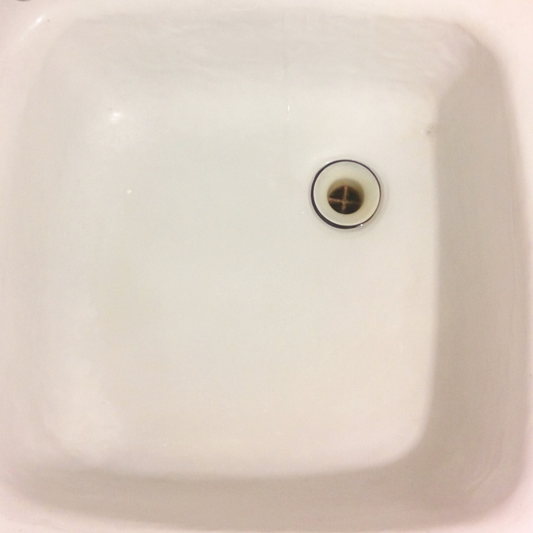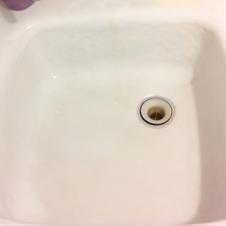 Раковина моя не всегда чиста - факт. Она еще и эмалированная, а значит отирается плохо, только со специальными средствами. Я использую Cif с отбеливающим эффектом, а кран добиваю иногда Sanfor.