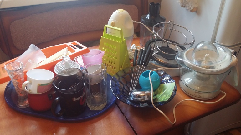 На выброс: одиночные чашки, лишние мерные стаканы, миксеры без крутилок, фондюшница-подарок (за 10 лет не воспользовалась).