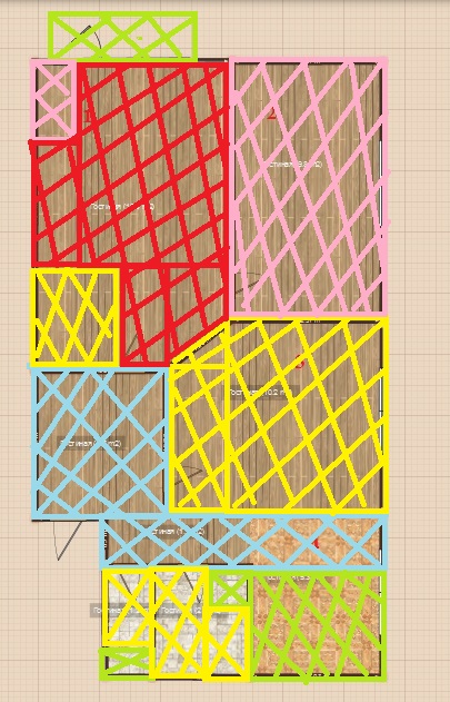 Зона 1 (голубой): двери (в коридоре их 5шт), коридор, прихожая, обеденная зона на кухне.