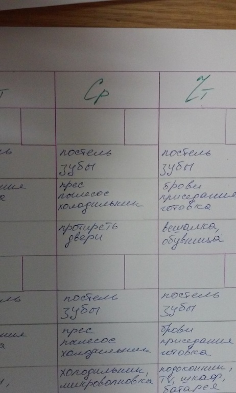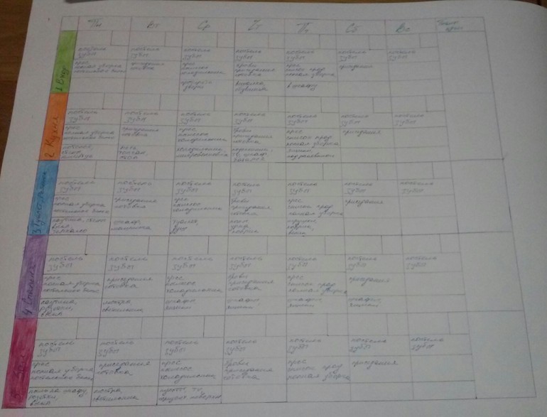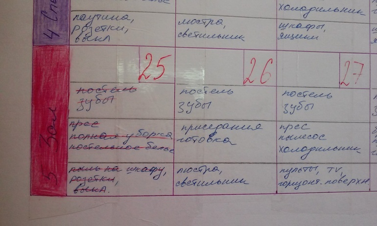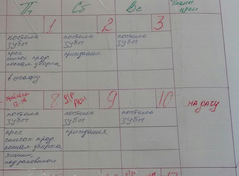 Делюсь опытом и идеямиПосмотрела я на свой КЖ и поняла, что мне сложно утром летать свой КЖ когда на мне весит ребенок (вообщем лень) И решила сделать настенный календарь на месяц. В него вошли главные ежедневные дела (которые могу забыть сделать или полениться) , еженедельные и ежемесячные, конечно оставила место для заметок и важных дат. Основу сделала на ватмане и заклеила скотчем, а сверху пишу число, важные даты, планы и идеи, и зачеркиваю уже сделанные дела для самоконтроля. В конце месяца можно легко все стиреть и опять останется основа для заполнения. Вот готовый вариант