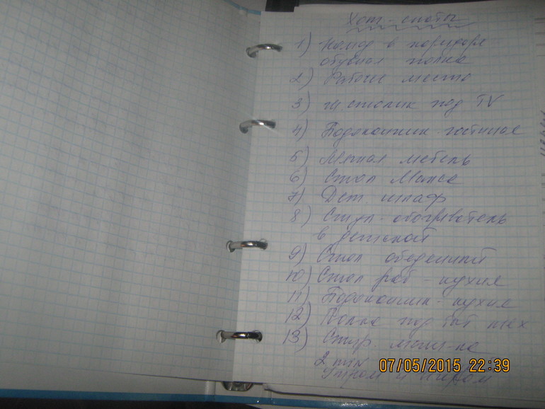 По заданию. Не так уж беспорядочен был мой КЖ, все списки в наличии. Контактные номера записала, но пока только родственников. Режим работы детского врача есть, телефоны больниц-поликлиник. Дни рождения записала, на каждый месяц отвела пол-страницы, получилась табличка. Список для экстремальной ситуации я распечатала, будем работать, очень надеюсь, что не пригодится никогда...Страшно об этом подумать. Список продуктов у меня остался ещё с "Поварешки", ничего пока не меняла.