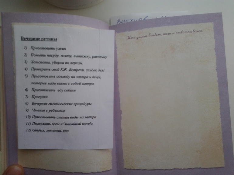 Хочется, чтобы журнал стал надежным помощником. Мой сейчас в стадии переделки. Не люблю я пользоваться блокнотами на кольцах, поэтому решила перенести информацию в обычный блокнот. Постоянную информацию я записываю любовно. Рутины и работы в зонах распечатаю и наклею. Если они изменятся, то можно и переклеить. Еще я через корешок протянула две резинки и буду туда вставлять сменные блоки. Первый ежедневник на неделю для TO DO и второй со списком для покупок и прочие временные записи.