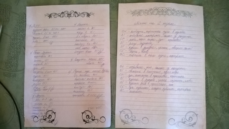 Повесила это дело на холодильник, в сб будет з.п. у мужа, пойдем все купим, ну а мне с моим меню проще готовить, т.к. каждый день ломаю голову что именно приготовить)