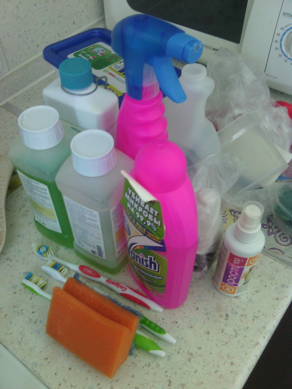 Список самого необходимого составила - перчатки, тряпки для посуды, адриэль (нравится, как чистит плиту). Еще из любимых средств - пемолюкс и Cif-крем.