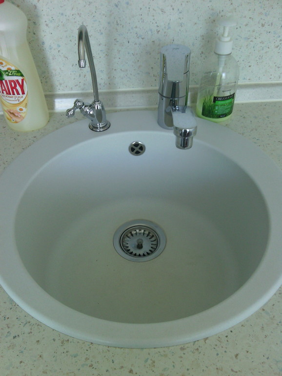 Раковину и шкаф под раковиной мыла неделю назад, поэтому под раковину даже не заглядывала - там все отлично. С самой раковиной есть большая проблема - дно не оттирается никакими средствами. Может, кто-то из флаюшек подскажет - чем лучше убрать серый налет на дне раковины из искусственного камня. Мне кажется. что он уже въелся и никакими способами от него не избавиться.