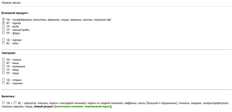 Ирин, а меню обязательно составлять? У меня поскольку готовлю сразу на всех и у младшего аллергия список того что готовлю небольшой, и поскольку покупки делаю практически каждый день, а не раз в неделю к примеру закупаемся, то в какой день что готовить зависит по большей части от того, что в магазине было в наличии и свежее