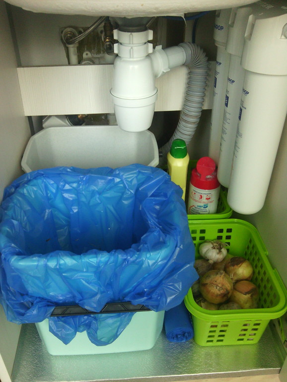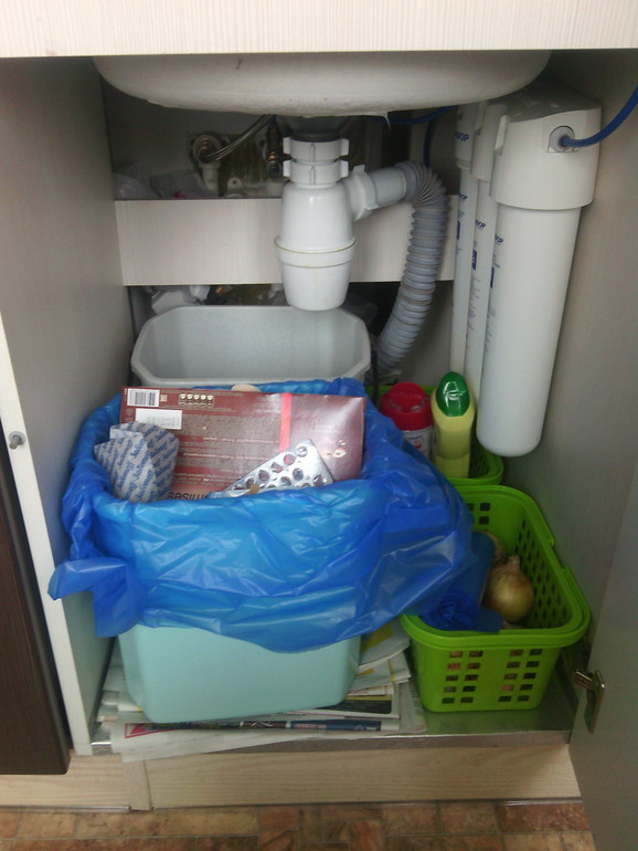 Честно, ничего лишнего сейчас под раковиной нет, участвую во взлете, поэтому в первый же день навела порядок в чистящих средствах. Сегодня просто протерла все под раковиной. Шкафчик под раковиной небольшой, поэтому всю химию, новую и ту, которой уже пользуюсь, храню в мини-кладовочке на кухне.