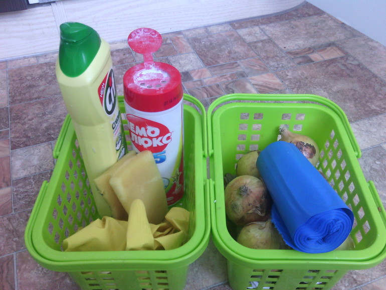 Две одинаковые корзиночки - в одной храню самые используемые чистящие средства + губка для плиты и рабочих поверхностей + перчатки, в другой - лук и чеснок.