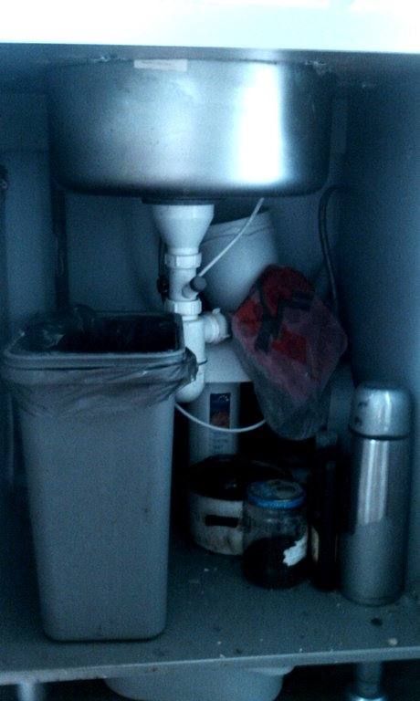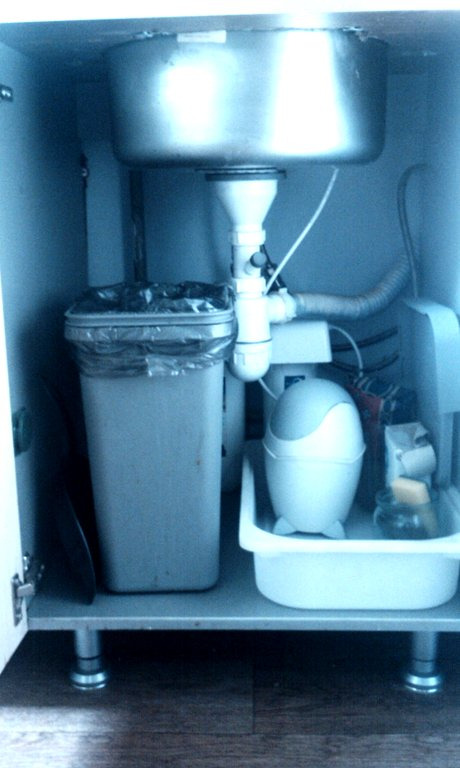 Ну, собственно, у меня там было всего немного, так как все чистящие средства храню в кладовке, а овощи в холодильнике, но все же нашлось что выкинуть - старую кострюлю и тефлоновую форму для выпечки плюс откровенный мусор.