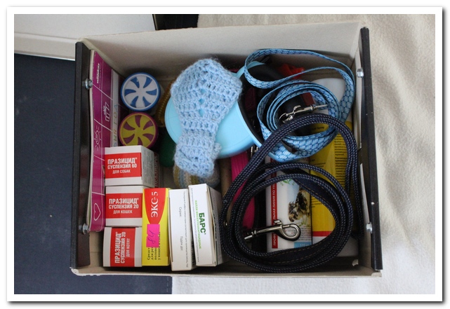 Неудачные мешки для кошачьего горшка в мешки для мусора, старые лекарства - в ведро, туда же остатки антицарапок, с тех пор как переехали в деревню и кошки гуляют вдоволь на улице - это небезопасно. Итог: не полная коробка, а треть. И все видно.