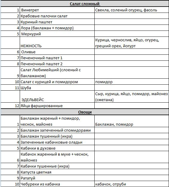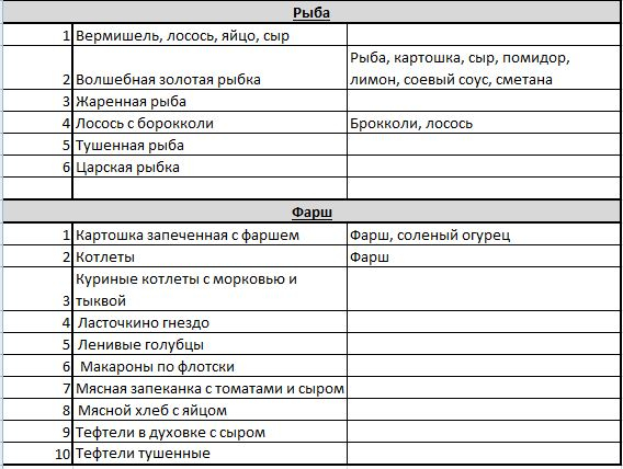 Такой список я составляла как-то давно, когда составляла меню. Он периодически дорабатывается. Сейчас хочу в него добавить рядом с названием еще список ингридиентов нужных для блюда.